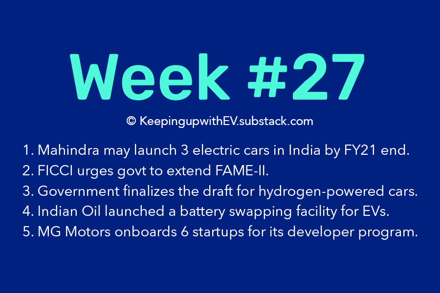 Mahindra to launch 3 EVs by 2021, FICCI urges Govt to extend FAME II, Govt finalizes policy for Hydrogen-powered vehicles, IOCL launches battery swap facility and MG Motors starts its startup cohort.