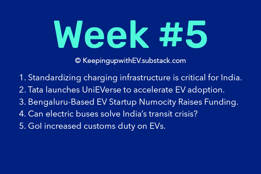 This week's substack includes news about customs duty hikes for EVs in India, Tata's plans to build a holistic EV ecosystem, Bangalore based Numocity fund raise and Pune's e-bus experiment.